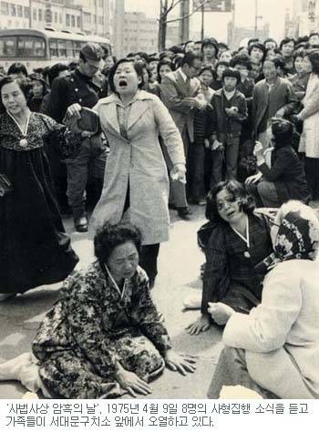 | ▲ <사법살인> 인혁당 사형집행 소식에 가족들이 오열하는 모습(1975. 4. 9) 제2차 인혁당 사건은 중앙정보부의 공작으로 조작된 공안사건이다. 민주화운동가들을 잔혹하게 고문하고 대법원에서 사형언도를 내린 지 18시간 만에 전원 처형하였다. 스위스에 본부를 둔 국제법학자회는 1975년 4월 9일! 이날을 <사법사상 암흑의 날>이라 항의했고 국제앰네스티도 4월 10일에 박정희 정권을 규탄하는 성명서를 발표했다. 박정희 정권의 잔혹함과 야만성을 드러낸 사건 가운데 하나이다 |