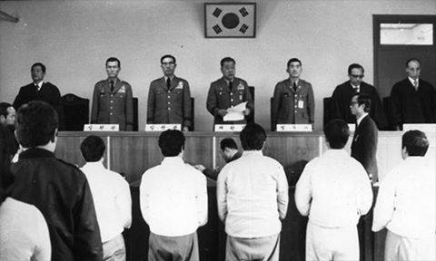 | ▲ 민청학련 사건 재판 광경 민청학련 사건 관련자들이 비상고등군법회의에서 재판을 받고 있는 장면으로, 심판관(재판관)은 현역 장성이며, 당시 재판장은 이세호 육군대장(가운데). |