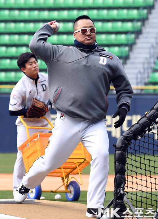 [매경닷컴 MK스포츠(잠실)=김재현 기자] 23일 오후 잠실야구장에서 벌어질 두산 베어스와 한화 이글스의 2019 KBO 리그 개막전에서 두산 조인성 코치가 경기 전 타격훈련에서 배팅볼을 던져주고 있다.