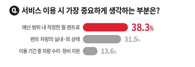 중고차로 장기렌트 서비스를 이용할 경우 가장 중요하게 생각하는 부분으로는 예산 범위 내의 적정한 월 렌트료(38.3%), 렌트 차량의 실내외 상태(31.5%), 이용 기간 중 차량 수리 및 정비 지원(13.6%) 순으로 나타났다. 중고차를 장기간 렌트로 이용할 경우 유지 비용면에서 합리적인 월 렌트료와 운행할 차량 상태에 대한 소비자 관심이 높은 것으로 보여진다.