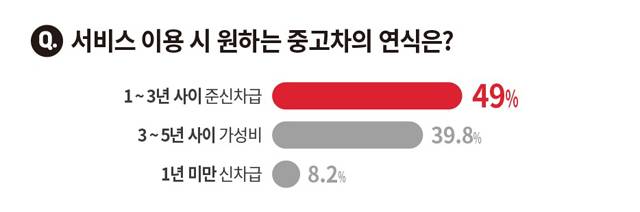 또한, 한 달 이상 장기간 중고차를 이용할 시 원하는 차량 연식으로는 1년에서 3년 사이의 준 신차급 중고차(49%)를 선호한다는 답변이 가장 많았으며, 3년에서 5년 사이의 가성비 높은 중고차(39.8%), 1년 미만의 신차급(8.2%) 순으로 선택했다. 이는 중고차 렌트 서비스를 고려하는 소비자들이 중고차를 이용함으로써 비용에 대한 부담은 덜면서 차량은 비교적 상태가 좋은 신차급 중고차를 원하는 것으로 풀이된다.