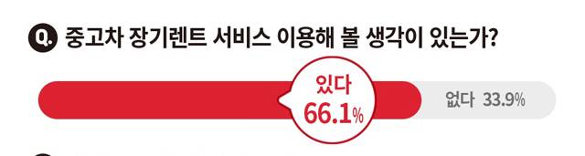 먼저, 중고차 장기렌트 서비스를 이용해 볼 의사가 있는지에 대한 질문에 66.1%가 이용해 볼 생각이 있다고 답했다. 중고차 장기렌트 서비스 이용을 고려해 본 이유로는 신차 렌트 대비 상대적으로 저렴한 월 렌트료로 차량을 운행할 수 있다(66.4%)는 점을 꼽았다. 이어 이용 기간이 최소 3개월 등 1년 미만으로도 자유롭게 설정이 가능하다(18.3%), 장기 렌트 이용 시 발생하는 초기 비용 부담이 적다(13.2%)는 의견이 뒤를 이었다.