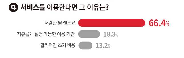 한편, 중고차 장기렌트 서비스를 이용해 볼 생각이 없다고 답한 이유로는 장기간 이용 시에 차량 문제가 잦을까 걱정된다(43.5%)는 점을 꼽았다. 그 밖에도 차량의 내외관 상태를 정확하게 미리 확인하기 어렵다(36.7%), 이용 차량의 전 차주 이력이나 용도가 확실하지 않다(19%)는 이유가 뒤따랐다.