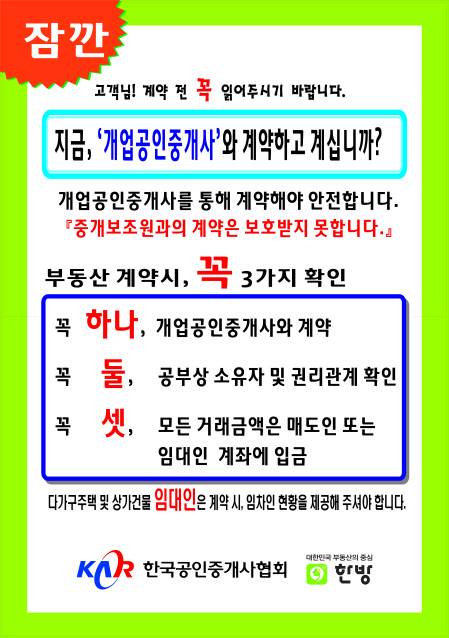 협회는 이번 캠페인을 통해 △개업공인중개사와의 계약 △공부상 소유자 및 권리관계 확인 △모든 거래 금액은 매도인 또는 임대인 계좌에 입금 등을 알릴 예정이다. 이런 내용이 포함된 대국민 안내 스티커와 전단지 12만부를 제작·배포할 계획이다.