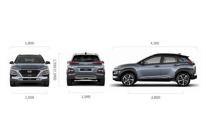 쌍용차 티볼리는 전장 4225mm, 전폭 1810mm, 전고 1620mm, 휠베이스 2600mm로 셀토스가 전장은 150mm, 휠베이스는 30mm 크게 나타난다. 현대차 코나는 전장 4165mm, 전폭 1800mm, 전고 1565mm, 휠베이스 2600mm로 셀토스와 크기 차이가 다소 난다.