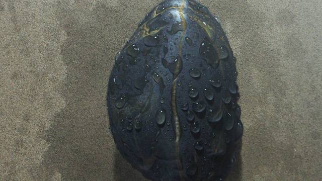 여기, 그림이 있습니다. 첫 번째 의문. 사진일까? 이 낯선 이미지가 전달하는 정보는 아주 단순합니다. 모래밭에 돌멩이 하나. 비를 맞은 건지, 일부러 물을 뿌렸는지 돌멩이도 모래밭도 젖어 있군요. 보이는 그대로입니다. 해가 화면 위쪽에서 아래로 빛을 뿌린 흔적이 그림자를 만들었고요. 언뜻 봐선 시멘트 바닥에 물에 젖은 돌을 올려놓고 찍은 사진 같죠?