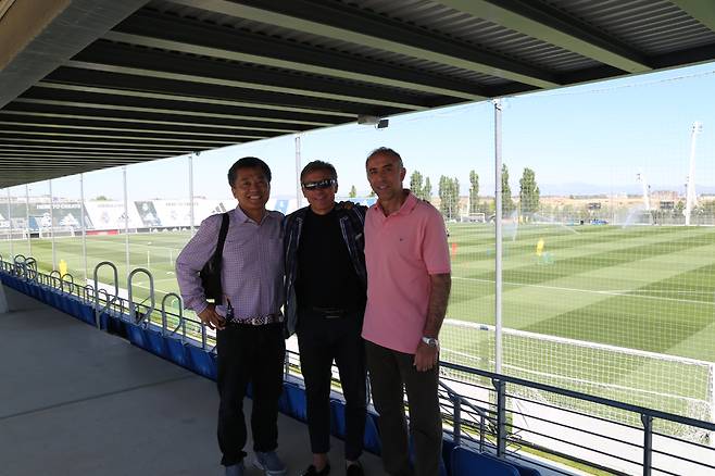 1군 선수들이 주로 연습하는 구장에서 함께 사진을 찍었습니다. 훈련장 소개는 레알 마드리드 재단의 총책임자인 라파엘 가르시아 코르테스 씨(사진 맨 오른쪽)가 해줬습니다. 라파엘은 1958년생으로 1970년대 후반과 80년대 초반 레알 마드리드 왼쪽 수비수로 뛰던 선수입니다. 구글에서 'Rafael Garcia Cortes'를 쳐보면 선수 소개가 나옵니다. 지금은 레알 마드리드 재단 총책임자로 이곳 발데베바스의 책임자이기도 합니다. 또 한 분은 파코 감독(사진 가운데)입니다.