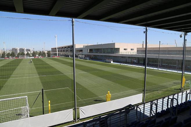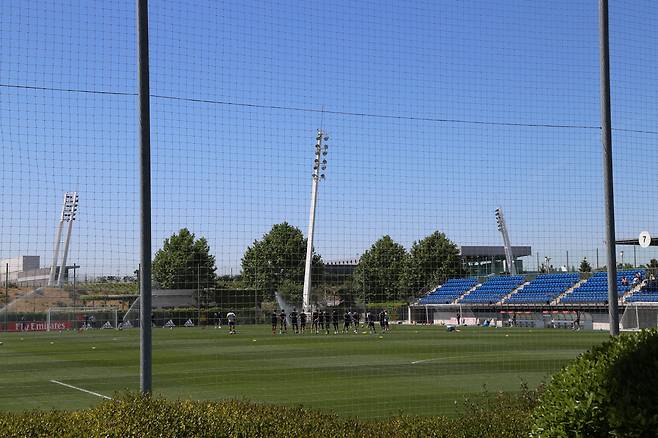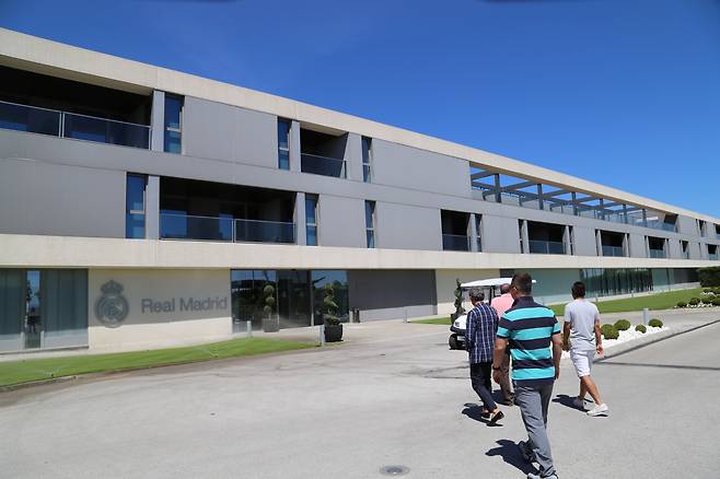 이곳에서 레알 1군이 훈련할 때 미디어 공개는 15분 정도만 한다고 합니다. 15분이 지나면 사진 오른쪽 건물 가운데 한 곳에서 커튼 같은 것이 내려와서 훈련장을 볼 수 없게 된다고 합니다. 우리나라 대표팀은 15분 훈련 공개할 때, 미디어 담당관이 철수해달라고 일일이 기자들에게 이야기하고 이 말을 듣고 나서 촬영기자들이 삼각대를 정리하며 이동하기 시작하는데, 시간 되면 그냥 커튼이 내려와 버린다니 정이 없어 보이기도 하지만 시간 약속 정한 대로 하는 것이니 양쪽 다 편하기는 하겠다는 생각도 들었습니다.