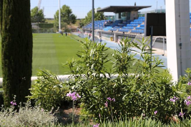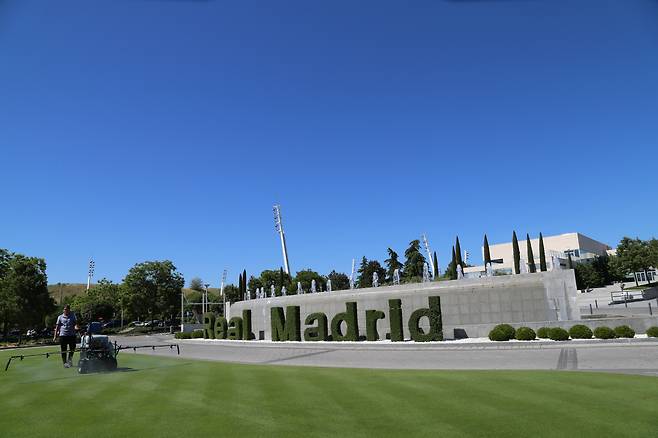 훈련장에 도착했을 때 직원 두 명이 나무로 조경된 이 '레알 마드리드' 글씨 바로 앞에 있는 잔디밭에 물을 주고 있었는데, 휴대폰으로 기념사진을 찍다가 잔디 가장자리를 살짝 밟자, 큰소리로 밟지 말라고 하는 것 같았습니다. 마음대로 밟거나 앉아서 쉬라고 만든 것은 아니고, 보기에 좋으라고 만든 관상용 잔디인 셈입니다. '양잔디'로 된 골프장에서 가장 흔하게 볼 수 있는 켄터키블루(그린보다는 페어웨이에 많이 심겨지는 품종)라는 잔디처럼 보였는데, 그 균일한 키와 빽빽한 밀도가 정말 양탄자 같아서 맨발로 한번 걸어봤으면 좋겠다는 마음이 들 정도였습니다.