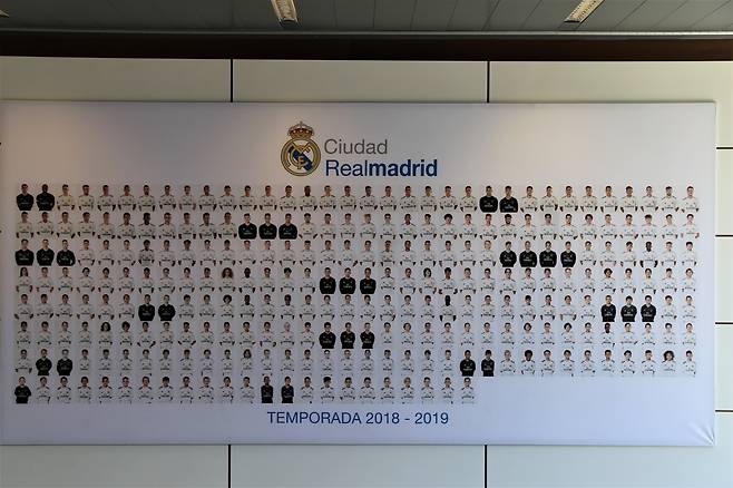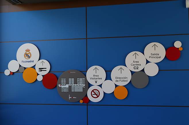 한 바퀴를 다 도니, 다시 입구로 돌아왔습니다. 출구에는 현재 레알 마드리드 선수들을 다 모아놓은 액자가 걸려 있습니다. 1군부터 시작해 각 연령별 소속 선수들이 모두 들어가 있습니다. 한국 선수가 한 명쯤이라도 있었으면 좋겠다는 생각을 해봅니다. 레알 마드리드 유스 시스템이 얼마나 잘 갖춰졌는지는 건물만 쭉 둘러봐도 알 수 있습니다. 가장 어린 팀이 상위 연령의 팀으로 들어가면 건물 안쪽으로 더 들어가게 됩니다. 그리고 가장 안쪽으로 들어가면, 실제 경사로 봐도 가장 높이 올라가게 되면, 그곳에는 바로 성인 1군팀이 쓰는 공간들이 있는 것입니다. 쉽게 말하면 건물 초입에는 가장 나이 어린 팀들이 이론과 실제를 배우고, 건물 초입과 멀어질수록 연령이 올라간 팀들이 그 공간을 사용하게 되는 것입니다. 설계도 그런 의도를 갖고 했다고 합니다.