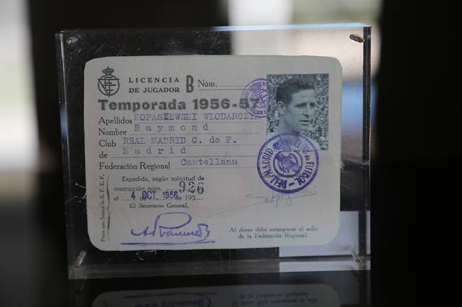 친절한 보안 요원과 인사한 뒤 건물 안으로 들어가면 레전드들의 옛날 사진과 선수등록증, 축구 용품 등을 볼 수 있습니다. 사진을 많이 찍을 시간이 없었는데, 운 좋게도 선수등록증 하나를 찍은 사진 중에 레이몽 코파가 있었습니다. 레알 마드리드의 미드필더로, 1958년 프랑스 선수 가운데 최초로 발롱도르를 받았던 선수입니다.