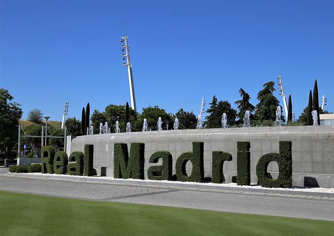 까다롭게 보이는 보안을 통과해 레알 마드리드 훈련장 발데베바스에 들어서면 아주 예쁘게 조경된 구단 이름과 만나게 됩니다. 관목인지, 어린 나무인지 모르겠지만, 나무를 다듬어서 저렇게 완벽한 알파벳을 만들 수 있다는 게 신기했습니다.