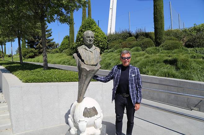 건물 입구 안내데스크로 들어가기 전에는 '산티아고 베르나베우 예스테'의 동상이 있습니다. 레알 마드리드의 유망주였지만 지금은 지도자와 스카우터로 일하고 있는 레알마드리드 재단 파코 감독이 베르나베우 동상 옆에서 포즈를 취합니다.