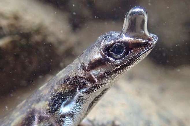 머리에 '잠수 헬멧'처럼 공기방울을 쓴 채 숨 쉬는 특별한 능력을 지닌 도마뱀을 미국의 연구자들이 발견해냈다.