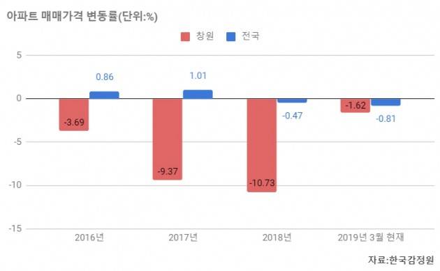 집값 하락세는 좀체 멈추지 않고 있다. 2016년 -3.69%를 기록한 창원 아파트 매매가격 낙폭은 2017년 -9.37%, 지난해 -10.73%로 점점 커졌다. 올해도 3월 현재 -1.62%를 기록 중이다. 전국 평균(-0.81%)의 두배에 달하는 낙폭이다. 한국감정원 주간조사에선 2016년 4월 둘째주부터 152주(2년 11개월)째 한 차례도 반등하지 못하고 내렸다.