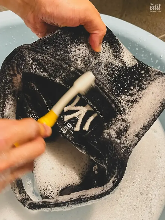 청소용 솔 대신 안 쓰는 칫솔, 부드러운 스펀지로 대체할 수 있습니다. 이마와 자주 닿는 밴드 부분, 땀이 굳어 소금띠가 생기는 모자 챙 윗면을 살살 문질러주세요.(너무 세게 문지르면 올이 일어나거나 모자가 찢어질 수 있으니 주의하세요!) 머리 뒤쪽의 버클과 스트랩 부분도 빠짐없이 닦아 주세요. 세제가 남아있을 경우 쇠로 된 파츠가 녹슬거나 변색이 될 수 있습니다.