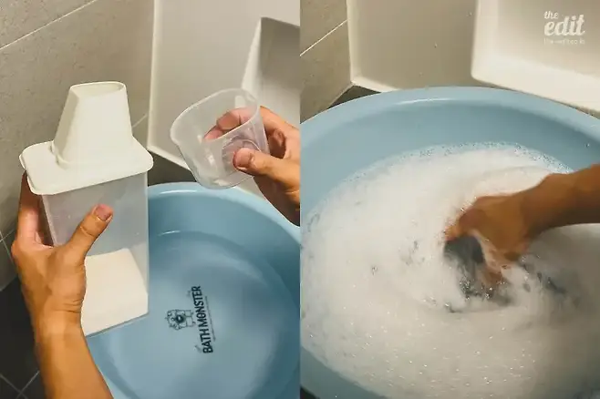 세제를 조금만 넣어도 거품이 잘 생깁니다. 손으로 휘적이며 거품이 충분히 생기게 해주세요. 이 거품을 이용해 오염 부위를 닦아낼 겁니다.