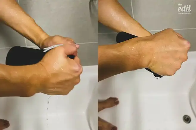 비틀어서 물기가 빠질 때까지 꽉 짜내는 게 아닙니다. ‘물을 많이 머금은 걸 살짝 털어낸다’라는 생각으로 살짝만 눌러줍니다.