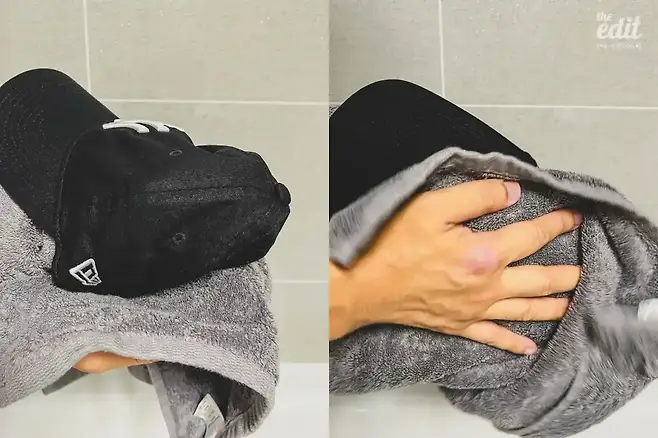 뽀송뽀송한 수건으로 모자를 감싸서 물을 빼줍니다. 모자의 챙, 앞면, 옆면 구석구석을 압착하여 빼주세요.