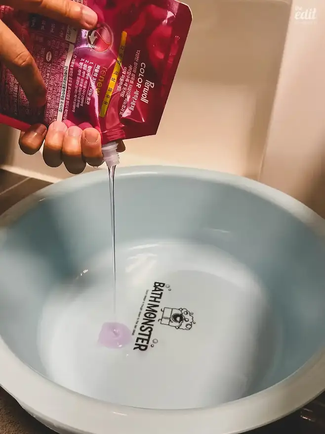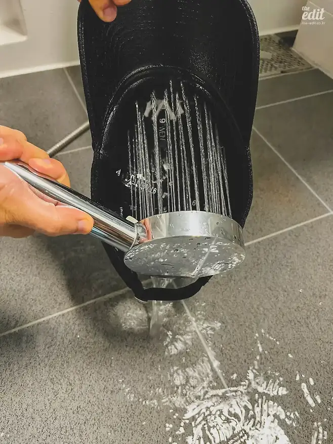 가정집 샤워기 기준으로 미지근한 물을 틀어주세요. 너무 뜨거우면 색이 잘 빠지고, 열 변형이 일어날 수 있어요. 중성 세제가 없으면, 주방 세제로 대체해도 큰 문제는 없습니다. 오히려 음식물이 묻었을 때에는 주방 세제가 더 깨끗하게 씻겨요.