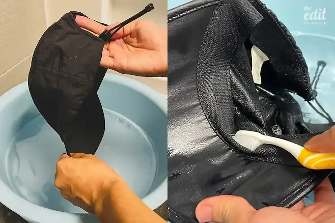 흰색 모자 또는 흰색 안감의 경우: 미온수에 중성 세제를 풀고 과탄산소다를 같이 넣어주세요. 살짝 뜨거운 물에서 잘 녹는데, 알갱이가 완전히 풀어질 때까지 휘저으며 녹여주세요. 흰색 원단에 찌든 때를 하얗게 벗겨내 줍니다. 10분 정도 불린 후에 솔로 살살 문질러 닦아내 주세요. 충분히 헹구지 않으면 얼룩이 더 생기니 주의해주세요.