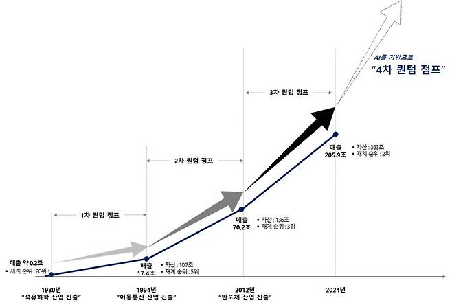SK는 지난 70여 년간 총 세 차례의 구조적 산업 전환을 통해 그룹 외연을 확장해왔다. 1953년 선경직물에서 출발한 이래 1980년 석유화학 산업에 뛰어들며 매출 2000억원 수준에서 첫 번째 도약을 이뤘고, 1994년 이동통신 진출 당시엔 17조4000억원의 매출을 기록하며 그룹 재계 순위도 5위로 올라섰다. 2012년 반도체 산업에 진출한 이후 SK하이닉스를 중심으로 매출 70조2000억원, 자산 136조원으로 또 한 번의 점프를 이뤘다. 현재는 2024년 기준 매출 205조9000억원, 자산 363조원 규모의 국내 2위 기업집단으로 성장했다.