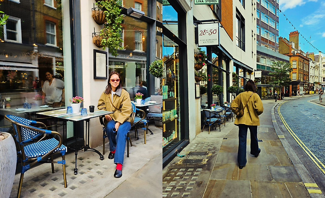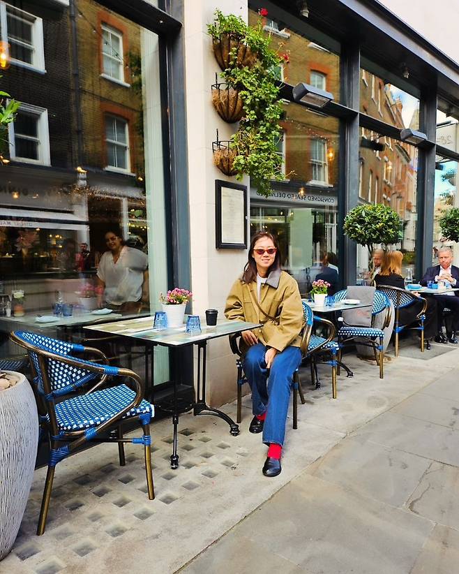 사진 속 공효진은 흰티를 이너로 입고 브라운색의 루즈핏 자켓과 청바지를 입었다. 블랙 로퍼를 신고 빨간 양말로 포인트를 주어 남다른 패션 센스를 선보였다.