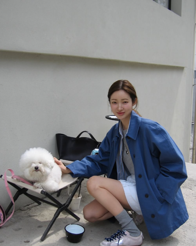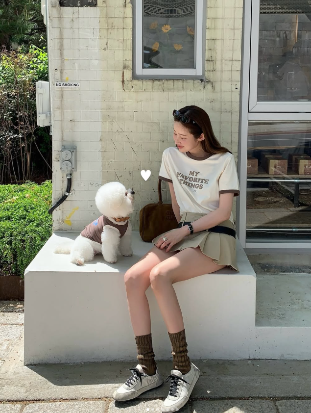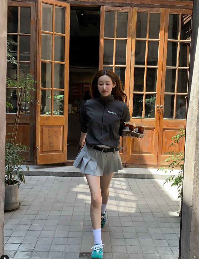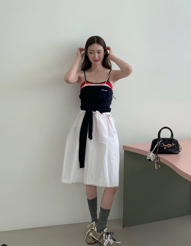 바지의 기장을 발목 위로 조절하고, 그 사이로 보이는 양말을 통해 룩에 리듬감을 더한다.그녀가 자주 활용하는 화이트 삭스는 특히 어떤 아이템과도 무난하게 어울리며, 여름철 밝은 톤의 데일리룩에 포인트를 주기에도 적절하다.