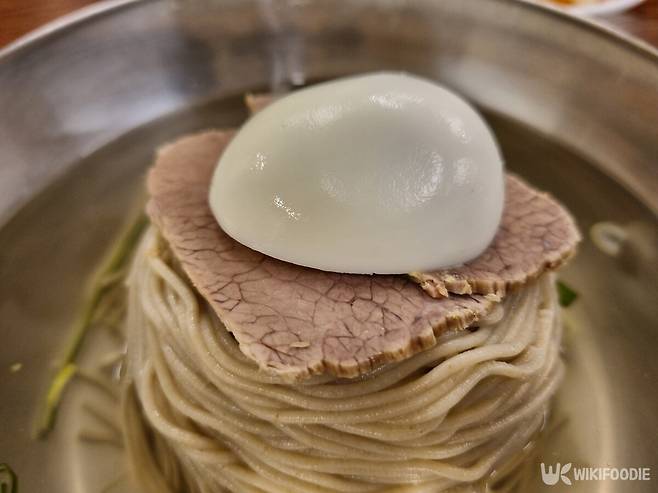 물냉면 육수는 진하다. 한우와 채소로 우려낸 국물엔 군더더기가 없다. 간은 절제돼 있다. 한 모금 들이키면 육향이 은은하게 퍼진다.