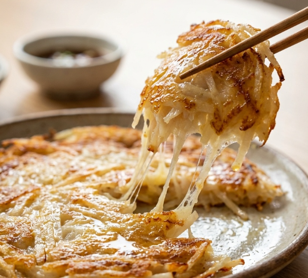 끓는 물에 데치지 않고 소금으로 수분만 빼서 만드는 무전입니다. 아삭함은 살아 있고, 감자전분 덕분에 떡처럼 쫀득해서 밥 대신 먹어도 든든합니다.