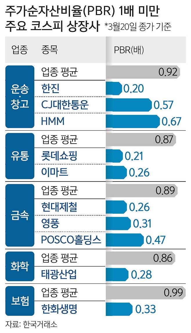 금융당국이 주가순자산비율(PBR)이 낮은 기업 리스트를 상시 공표하기로 하면서 대표적인 저PBR 종목인 한진·이마트·영풍 등 주요 코스피 상장사 발등에 불이 떨어졌다.