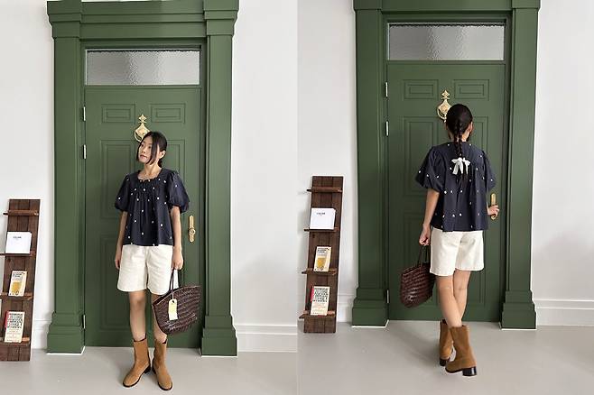 블라우스 뒤쪽에 리본이 있어서 더 귀엽더라구요.