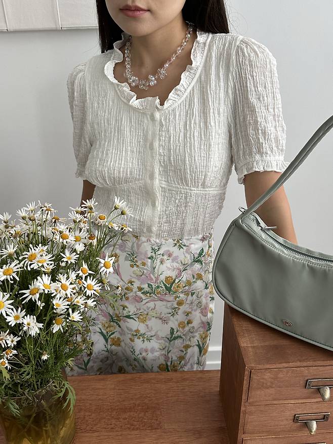 프론트의 셔링 디테일과 데이지 꽃 자수가