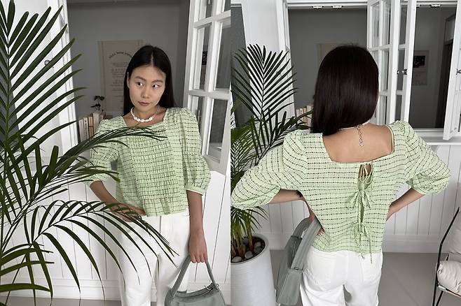 시원시원함이 한눈에 느껴지던 스퀘어넥 스모크 셔링 블라우스!