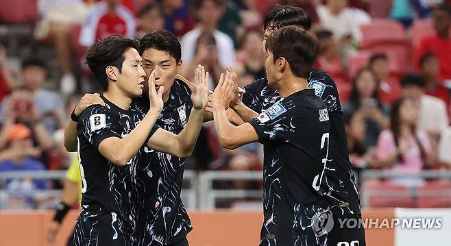 (싱가포르=연합뉴스) 신현우 기자 = 6일(현지시간) 싱가포르 국립경기장에서 열린 2026 북중미 월드컵 아시아 2차 예선 조별리그 C조 5차전 한국과 싱가포르의 경기. 전반전 선취골을 넣은 이강인이 동료선수들과 하이파이브를 하고 있다. 2024.6.6