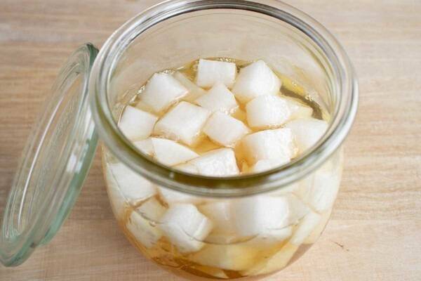 재료: 무 1/3개, 꿀 1큰술, 따뜻한 물 200ml