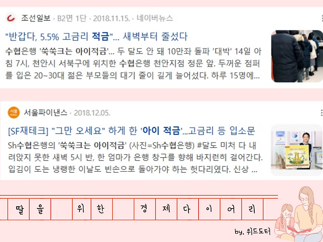 아이가 5살 무렵, 당시 적금 이율이 너무 낮아서 고민이 많았어요. 그런데 어느 날, 나라에서 지급하는 아동수당과 연계해서 월 10만 원씩 불입하면 5.5% 금리를 받을 수 있는 상품이 출시된다는 소식을 들었어요. 바로 수협 쑥쑥 크는 아이 적금이었는데요, 이 소식이 알려지자마자 부모님들 사이에서 큰 화제가 되었고, 가입하려는 사람들이 몰려 뉴스에도 나왔던 기억이 생생해요.