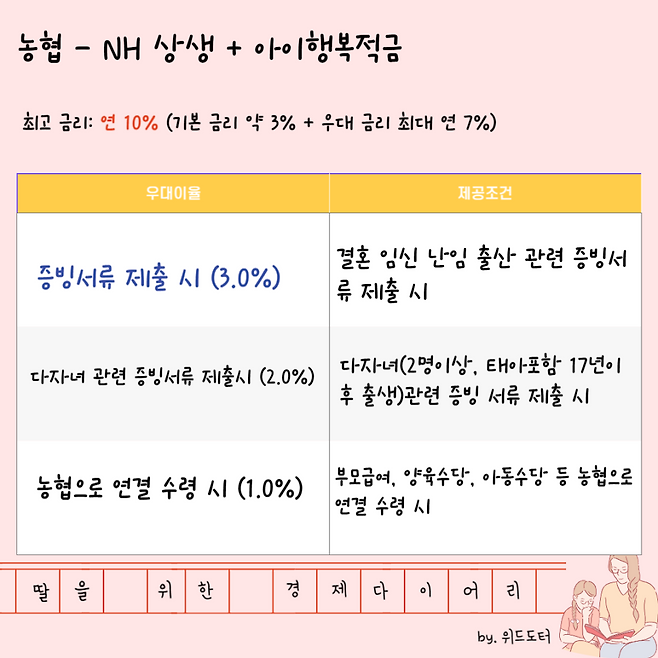 사회공헌 차원에서 설계된 상품으로, 출산 장려와 다자녀 가구 지원에 최적화.
