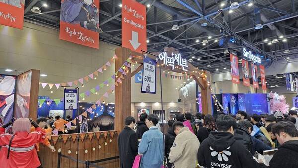 전시장 중앙에는 메인 스폰서 스마일게이트가 대형 부스를 꾸렸다. ‘에픽세븐’ 존은 나무 아치와 전구 장식으로 작은 축제 마을처럼 연출했다. 옆에는 신작 ‘미래시’ 무대가 설치돼 코스어들이 캐릭터 복장을 하고 포즈를 취했다. 팬들은 삼각대를 세우고 사진과 영상을 찍느라 분주했다. 뒤편 ‘무료 복권’ 코너에는 폴딩 카트와 피규어를 받기 위한 줄이 수십 미터 이어졌다. 체험을 마치고 나온 관람객들 손에는 스탬프북과 굿즈 쇼핑백이 하나씩 들려 있었다.
