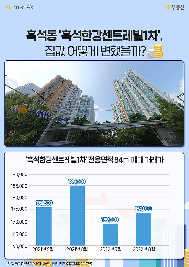 입주순으로 살펴보겠습니다. 2011년 입주를 한 5구역 '흑석한강센트레빌1차' 전용면적 84㎡는 올해 8월 17억4,000만원에 실거래 됐습니다. 작년 5월 17억5,500만원에 거래된 것에 비해 집값이 낮아지긴 했습니다. 하지만 이는 부동산 시장이 전체적으로 하락장인 영향이 미친 것으로 해석됩니다. 무엇보다 잠실의 집값 하락폭이 5~7억원대인 것을 감안하면, 흑석동 재개발 구역은 집값 하락폭도 크지 않은 편 입니다.