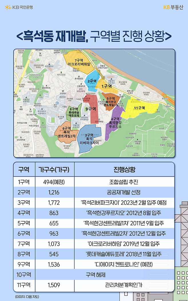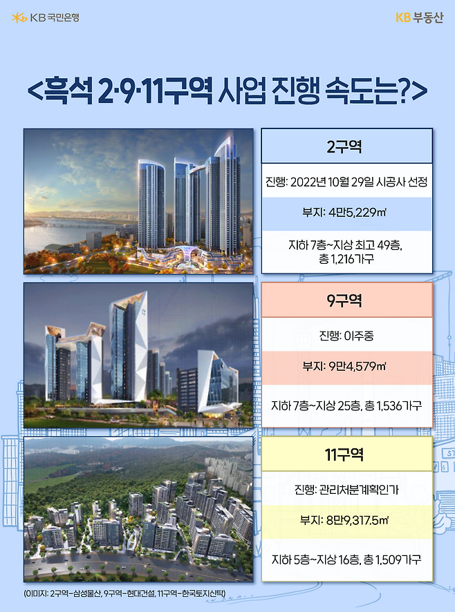 현재(2022년 10월 기준) 사업이 진행되는 구역은 1구역(조합설립 추진), 2구역(공공재개발 선정, 시공사 선정 예정), 3구역('흑석리버파크자이' 2023년 2월 입주 예정), 11구역(관리처분인가), 9구역('디에이치 켄트로나인'(예정))인데요. 이미 시공사 선정 후 착공에 들어간 3구역과 9구역을 제외하면 총 3개의 구역에서 사업이 진행 중입니다.