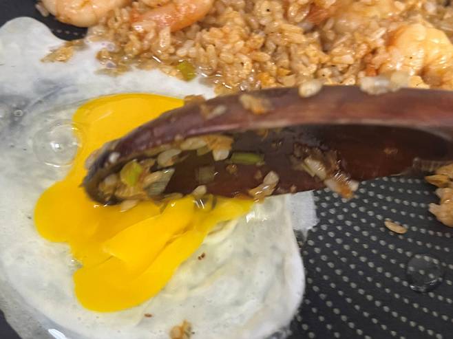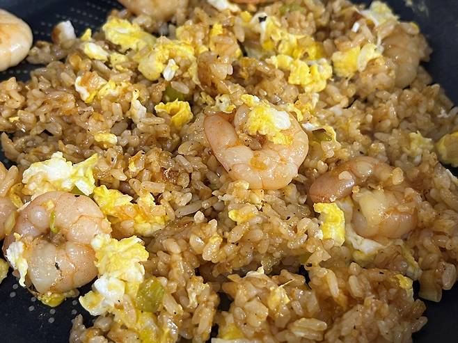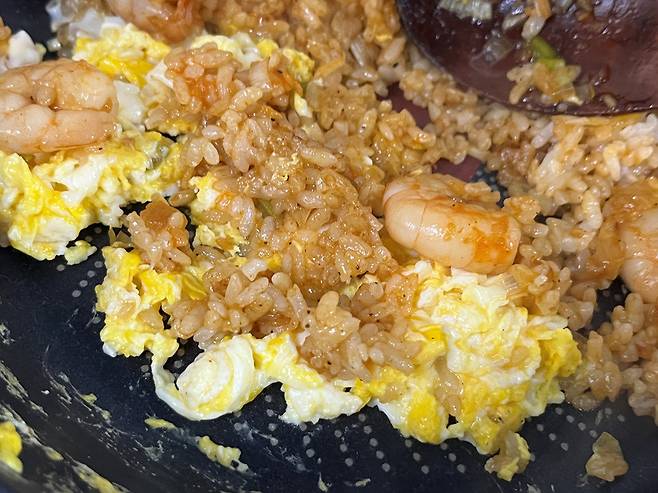 그다음 계란과 볶음밥을 고르게 섞어 줍니다. 계란을 먼저 넣고 밥을 비비면 밥알이 계란 물과 함께 뭉치고 질척해질 수 있습니다. 계란은 꼭 마지막에 넣어 주세요.