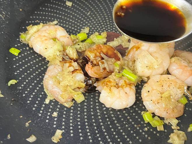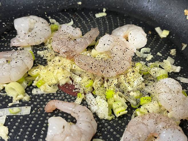 해동한 냉동 새우를 넣고 후추도 넣어 주세요. 그리고 재료를 모두 함께 볶습니다. 마늘, 파의 향이 새우의 비린내를 잡는 역할도 합니다.