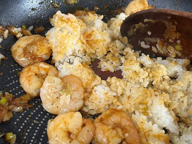 밥 1 공기를 넣고 재료 및 양념과 잘 섞어가며 볶습니다. 양념이 뭉치면 짤 수 있기 때문에 최대한 고르게 섞어가며 볶으세요.