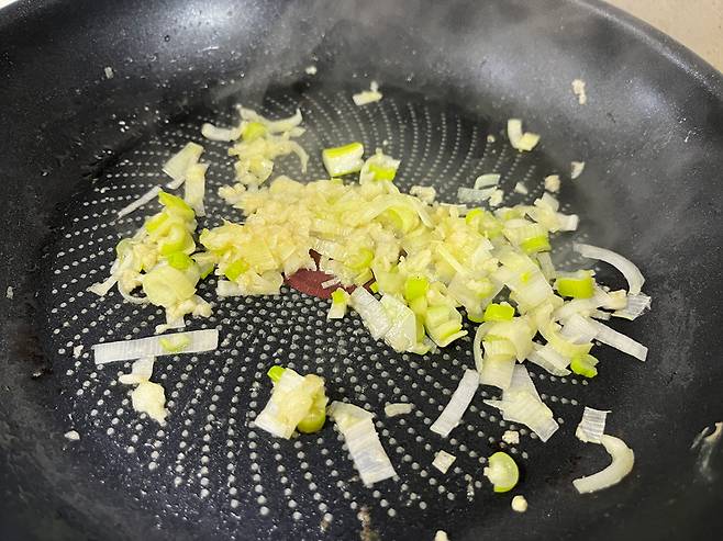 다진 마늘과 대파를 기름에 볶아서 향을 냅니다. 볶음밥 만들 때 대파와 마늘 먼저 볶아주면 기름에 풍미가 배면서 요리 전체의 향과 맛이 깊어집니다.