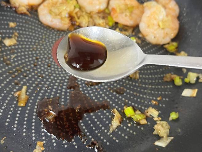 굴소스도 1/2스푼 넣습니다. 굴소스는 진한 감칠맛 때문에 소량만 넣어도 풍미가 확 살아납니다. 또한 조금 더 이국적인 맛을 낼 수 있습니다.