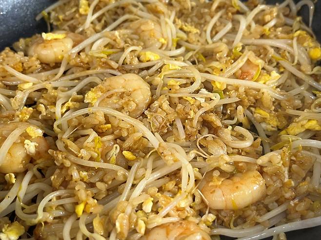 숙주를 좋아하시면 숙주 1줌을 마지막에 넣고 1분 정도 볶아주면 동남아 스타일의 볶음밥을 만들 수 있습니다. 물론 숙주를 안 넣어도 충분히 맛있습니다.