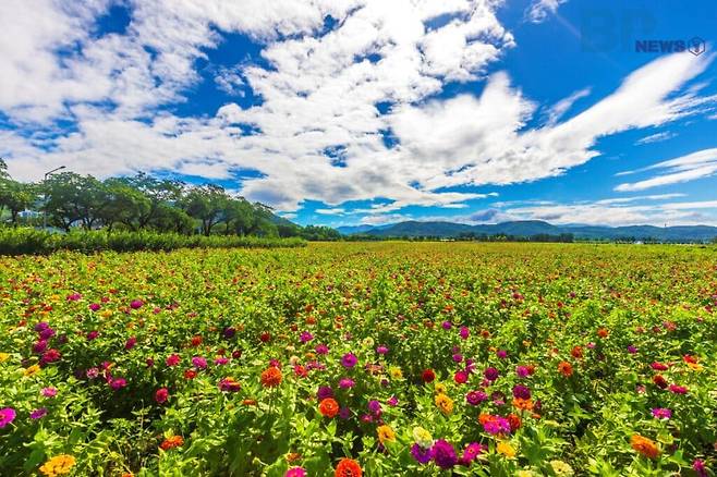 해마다 다른 꽃들이 식재되어 경관에 색다른 재미를 주는 논공 꽃단지에서는 올해 백일홍이 물들어 대구 시민들에게 기쁨을 주고 있다.