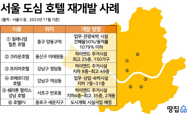 강남구 청담동 프리마호텔과 역삼동 강남 르메르디앙호텔, 서초구 반포동 쉐라톤팔래스강남 등 3개 호텔은 고급 주거시설로 탈바꿈한다. 모두 1980년대 지어졌다.