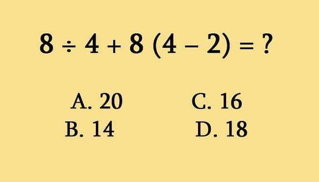 즉, '8 × 2 = 16'이라는 등식이 성립하게 됩니다. 다시 이를 정리하면 '8 ÷ 4 + 8 ( 4 - 2 ) = ?' 은 곧 ' 2 + 16 = ?'으로 정리해볼 수 있고 자연스레 정답은 'D. 18'이 됩니다.
